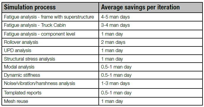 下表是不同的分析类型,在使用系统后节省的时间统计。在多车型、多学科、大量工况和分析迭代下,可以节省的时间或提升的效率是相当可观的。从安全、CFD、结构耐久、NVH等学科平均考虑,通过SimManager对自动化的封装应用,前处理节省时间15%,后处理节省时间80%。
