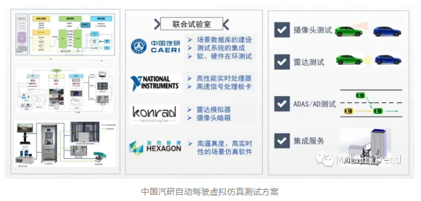 基于这一发展趋势和挑战,海克斯康、中国汽研、NI、Konrad成立了虚拟仿真联合实验室,可以提供摄像头、毫米波雷达的测试服务以及测试台架的集成服务,部署了从感知、决策到执行三个层面的仿真测试方案,助力中国汽研的“场景库+仿真测试方案”双向布局战略。