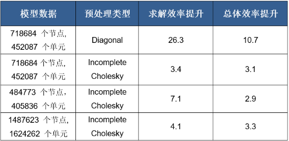 2.5 GPU支持Marc迭代稀疏求解器(求解器类型2),对于适用模型可以明显提高求解效率、减少求解时间。下表列出了一些模型(均采用六面体和四面体单元)运用GPU求解技术对求解效率提升倍数的比较。