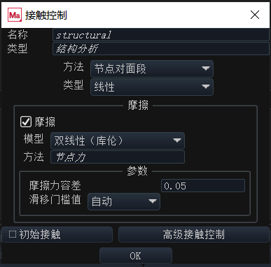2.3 集成了MSC Nastran的线性接触分析功能。对于相对滑动很小的接触分析模型,使用“线性接触”选项,只需在分析开始时建立接触约束关系,因为以后不会再有新的节点、线段或面段进入接触,接触约束始终采用初始配置中所建立的。